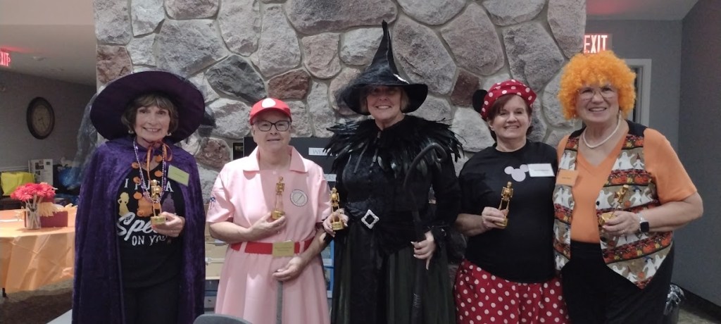 Our October meeting was a lot of fun, featuring Halloween games, treats, and plenty of laughter. Here are the winners of our costume contest: The Best Costume award went to Jeannie, Most Original to Nancy, Scariest to Jackie, Sweetest to Minnie, and Funniest to Betty.